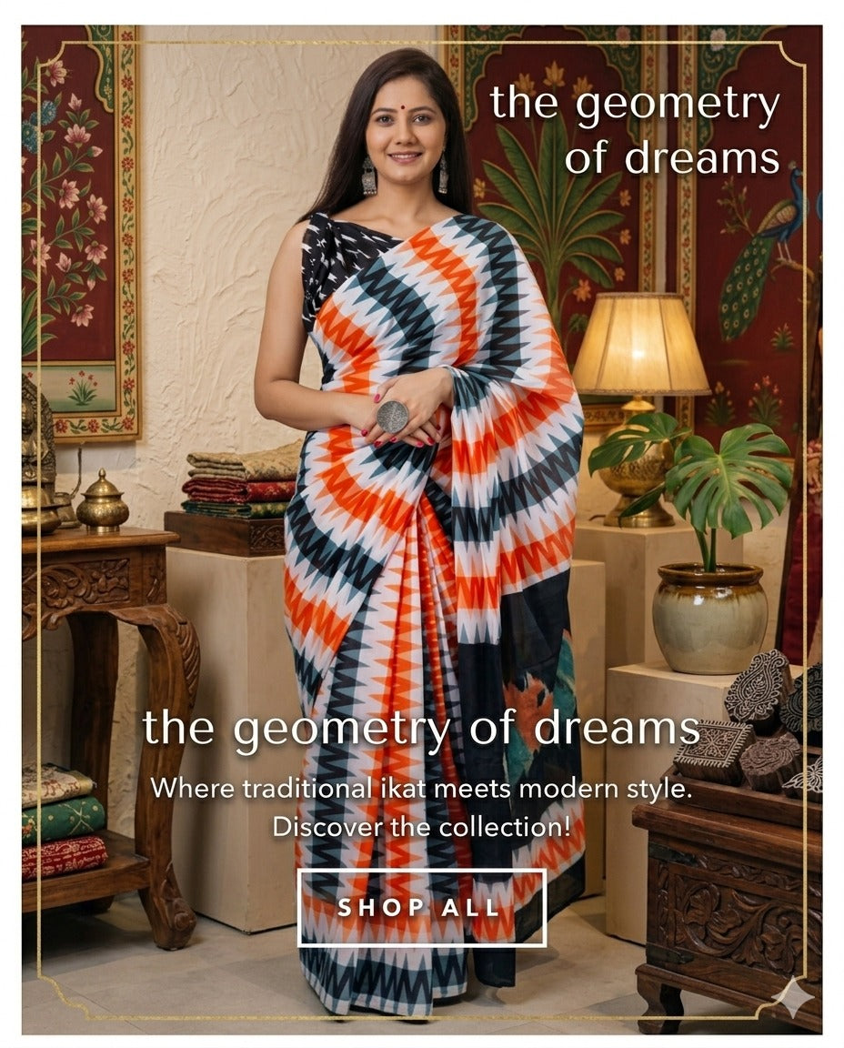 Multicolor Ikat Print Cotton Saree for Women | Black, White, Orange & Blue